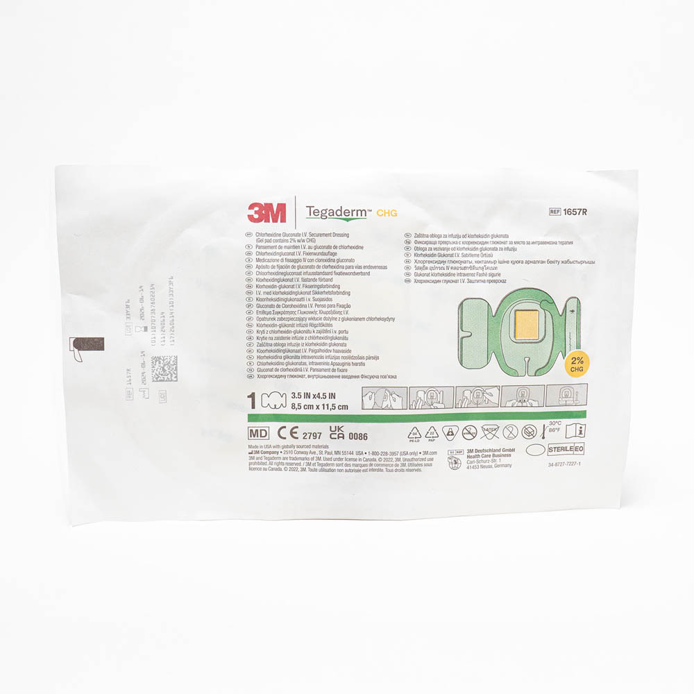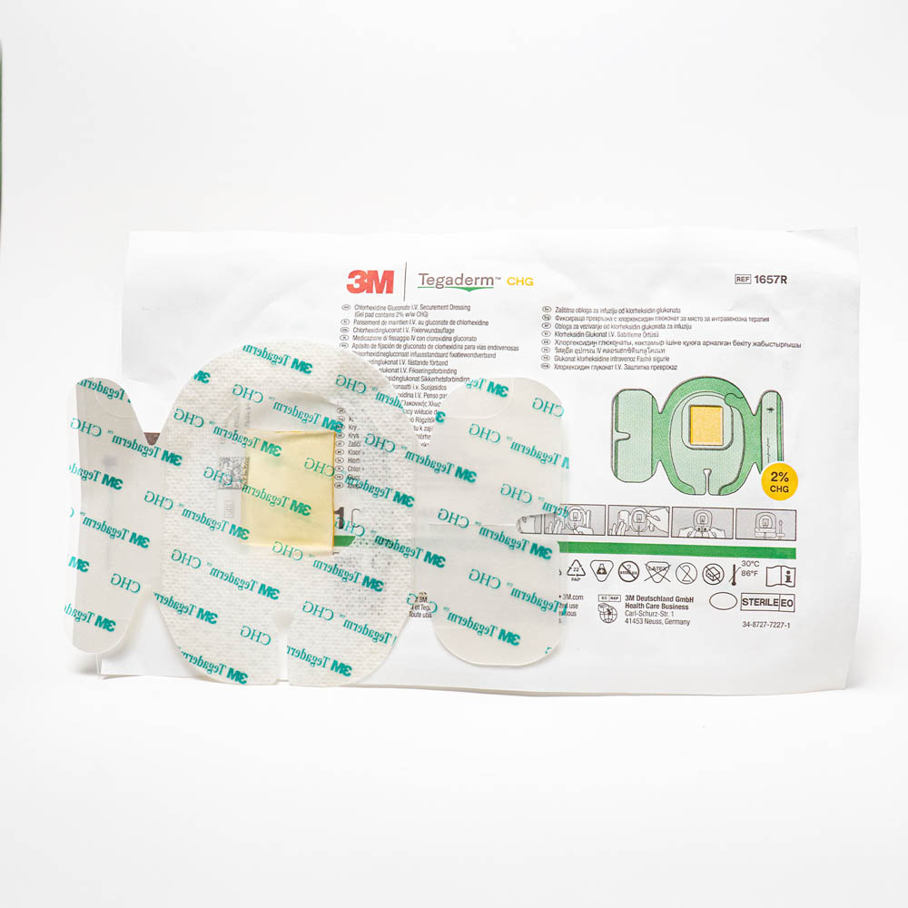 Tegaderm CHG es un apósito estéril compuesto por una película transparente, permeable a oxígeno y vapor húmedo, impermeable a líquidos, bacterias y virus, que contiene una almohadilla de gel transparenteimpregnada con gluconato de clorhexidina al 2% y adhesivo de acrilato.