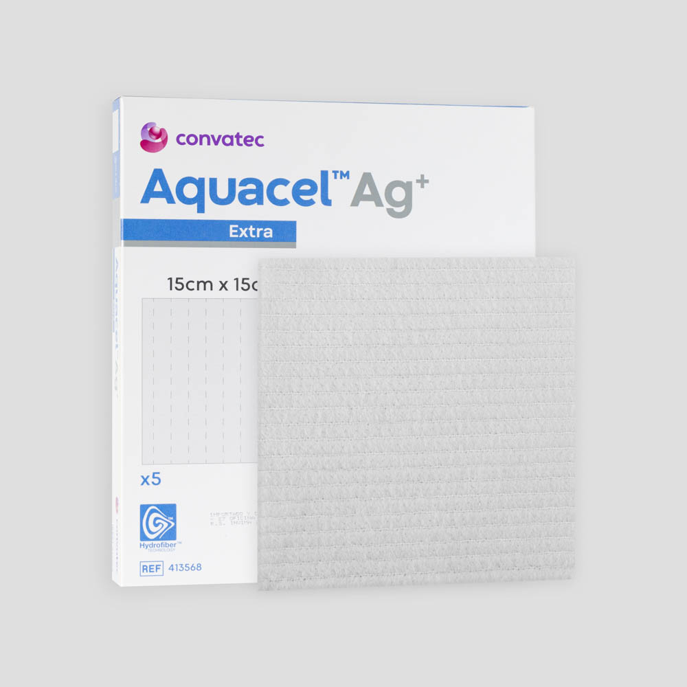AQUACEL Ag+ EXTRA, apósito potenciado de Hydrober con plata y fibra reforzante, es un apósito en cinta suave, estéril, no tejido hecho de dos capas de carboximetilcelulosa sódica impregnada con un 1,2% de plata iónica.