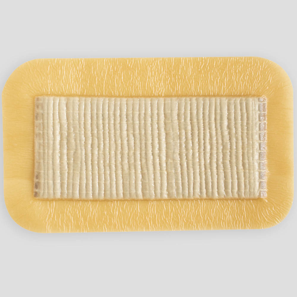 Esta almohadilla se mantiene fijada entre una capa superior de Hidrocoloide, la cual está unida a un film de poliuretano, y una capa con ventana en contacto con la piel que se compone de un film de poliuretano situado entre dos capas de Hidrocoloide.