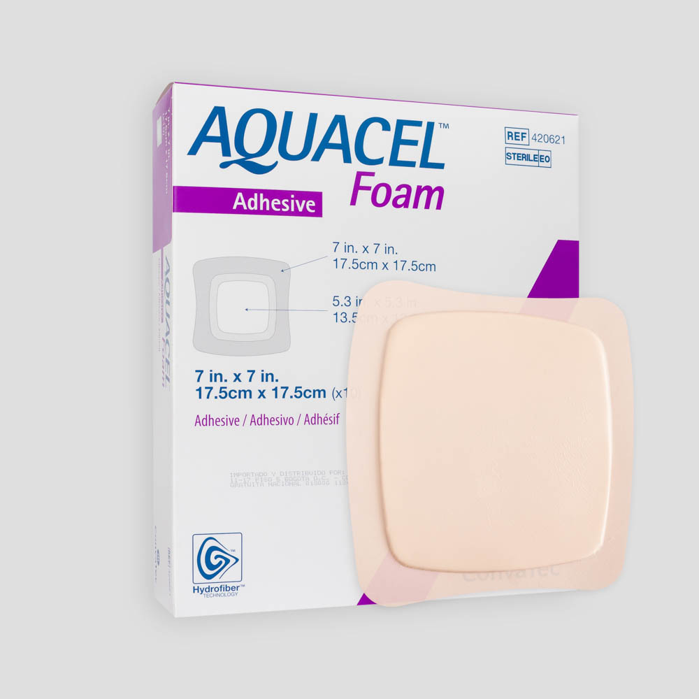 Los apósitos AQUACEL espuma adhesivo y no adhesivo, son una gama de apósitos estériles de espuma de Hydrofiber para el cuidado de heridas, compuesto por un film externo impermeable de poliuretano y una almohadilla multicapa absorbente; el apósito adhesivo presenta un borde adhesivo de silicona.