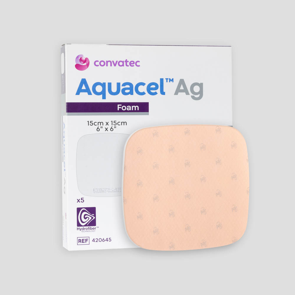 El apósito AQUACEL Ag espuma adhesivo, tiene una gama de apósitos estériles de espuma de Hydrofiber™ para el cuidado de heridas, compuesto por un film externo impermeable de poliuretano y una almohadilla multicapa absorbente; el apósito adhesivo presenta un borde adhesivo de silicona.