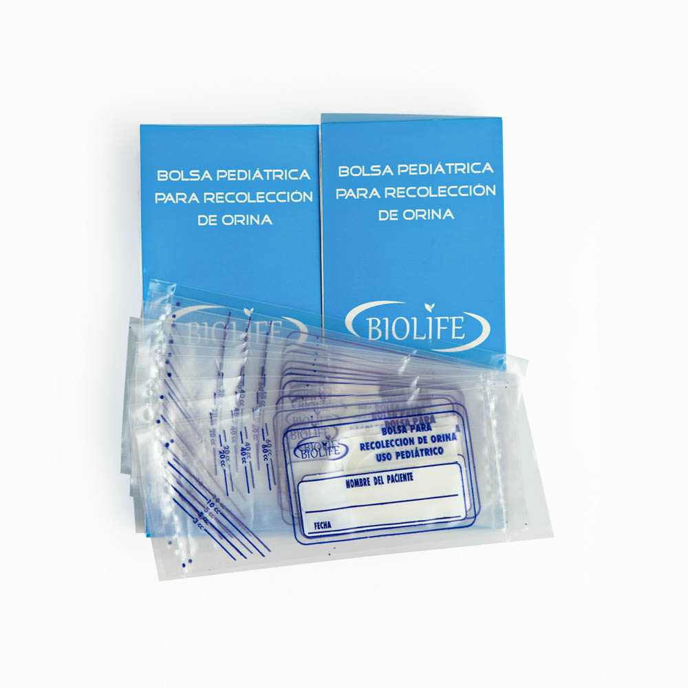 Bolsa para recolección de orina pediátrica con capacidad útil hasta 60cc, libre de patógenos, impresión en tinta para serigrafía, área para inscripción de la información del paciente, adhesivo hipoalergénico con baja resistencia al desprendimiento para evitar laceración en la piel del paciente, empleada para facilitar la toma de muestras de orina en menores de edad sin control en la micción.
