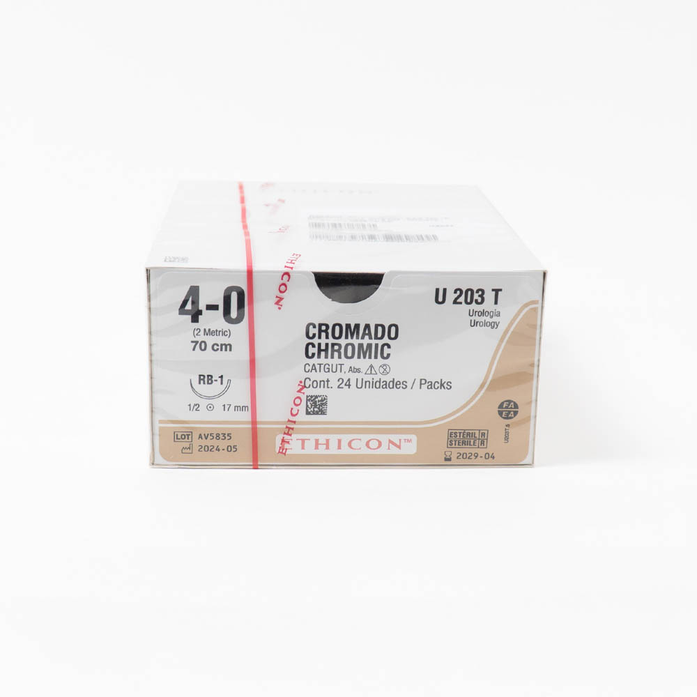 El Catgut Cromico Calibre 4/0 Urología de Longitud 70 cm Aguja RB-1 17 mm Master de la marca ETHICON con el código U203T es un producto utilizado en procedimientos quirúrgicos para suturar tejidos. Está fabricado con catgut cromado, un material biodegradable que se descompone en el cuerpo a medida que se cura la herida. Este catgut cromado tiene propiedades que lo hacen resistente a la absorción por parte del organismo, lo que permite una mayor duración en el tejido.