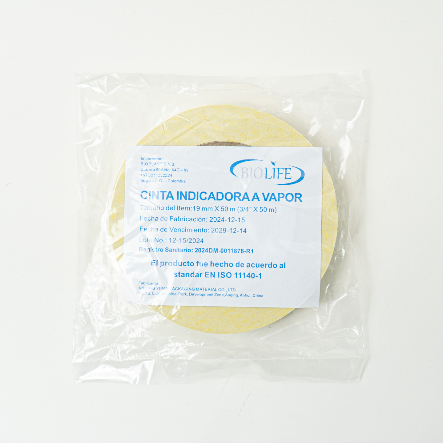 Diseñada para adherirse firmemente a paquetes o envoltorios médicos, cambia de color al completar el ciclo de esterilización, lo que permite verificar visualmente que el proceso fue exitoso. Resiste altas temperaturas y humedad sin desprenderse ni dejar residuos.