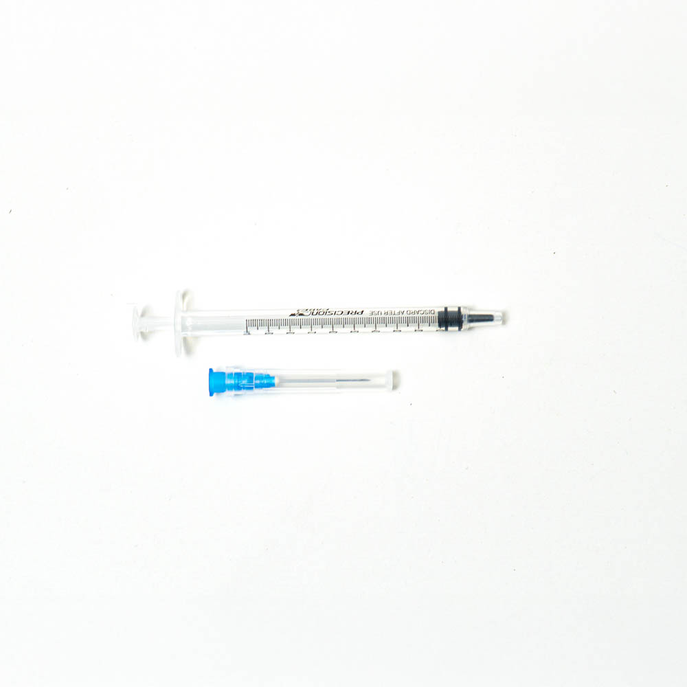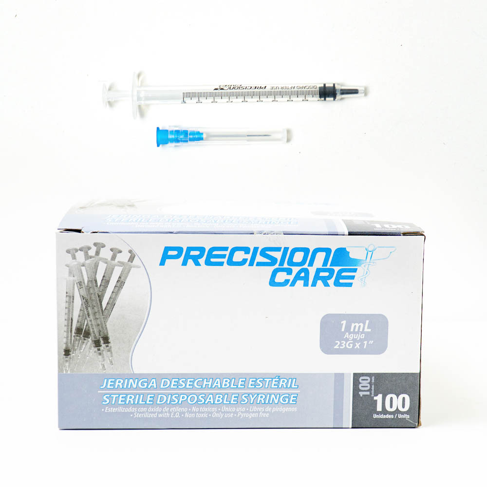 hueco de polipropileno transparente con un émbolo en su interior que aspira o impele el líquido, según el movimiento que se le dé, y con un extremo terminado con conexión luer lock (sistema rosca) donde se introduce la aguja, que se inserta (si aplica) para realizar extracción de líquidos o administración de medicamentos, con escala medición de fácil lectura e imborrable Jeringa de 3 partes desechable estéril, con aguja y