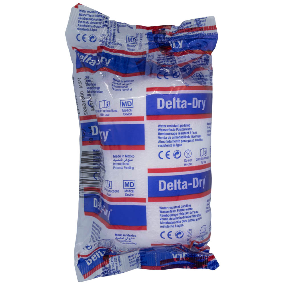 Algodón Acrílico Delta Dry es un acolchado ortopédico utilizado para yeso sintético, hecho de tejido acrílico hidrófobo, diseñado para permitir que el agua pase a través del material y no quede retenida en éste, permitiendo al paciente bañarse o incluso la inmersión en agua, sin riesgo de maceración de la piel.
