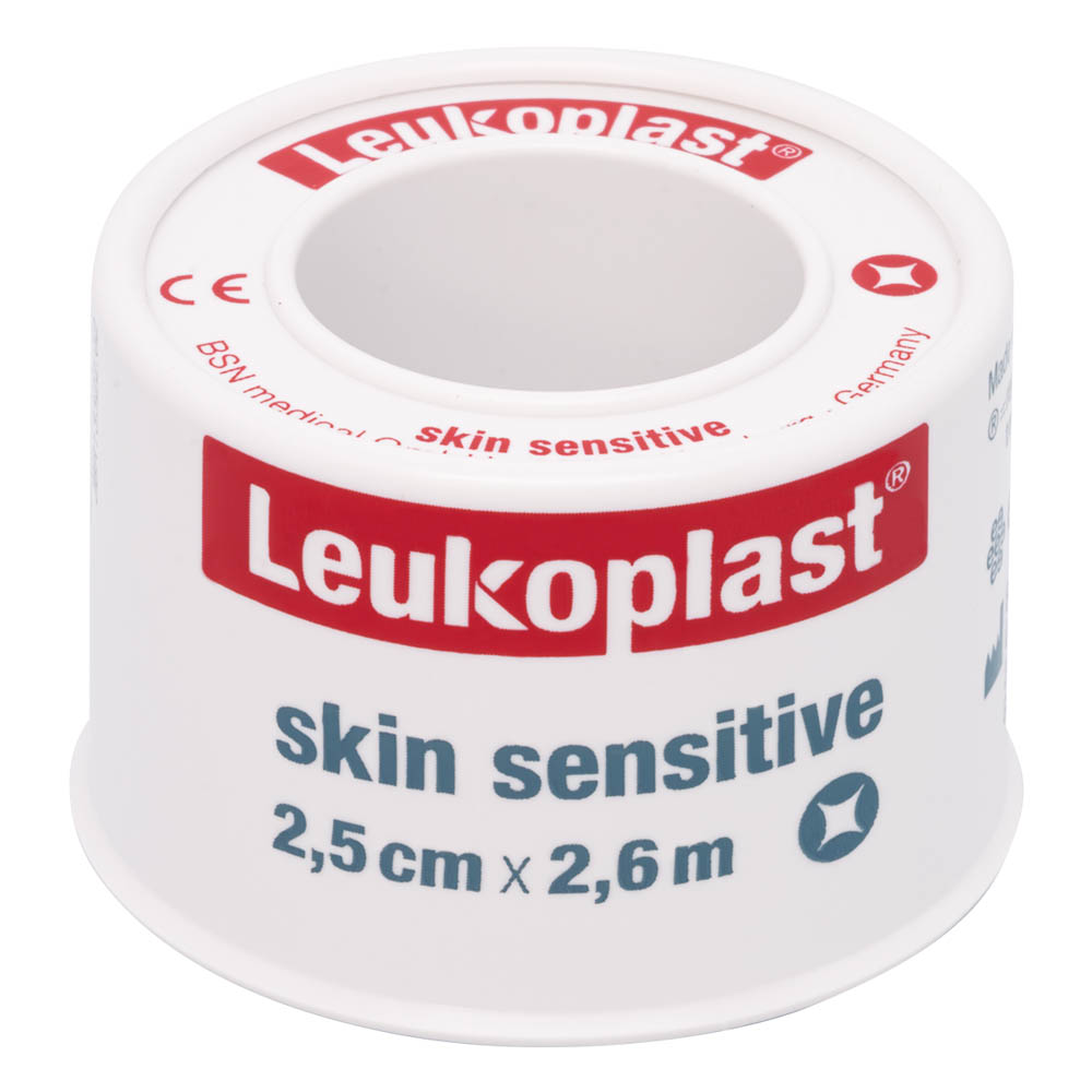 – Leukoplast Skin Sensitive es un esparadrapo o cinta adhesiva está diseñada para la fijación de apósitos para heridas y la sujeción adicional de dispositivos, como catéteres, tubos, sondas o drenajes.
